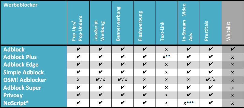 In der folgenden Tabelle sind einige Werbeblocker aufgelistet. Sie wurden darauf getestet, welche Werbeformate sie blockieren und welches Add-On in welchen Bereichen nicht funktioniert.
