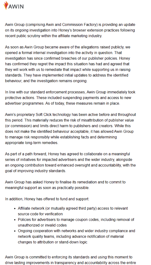 Und was sagt der Elefant im europäischen Affiliate-Raum zu den Vorfällen? Awin hat sich tatsächlich endlich zu der Kooperation mit Honey in einem Schreiben an seine Advertiser geäußert. Das Schreiben haben wir hier für euch abgebildet: