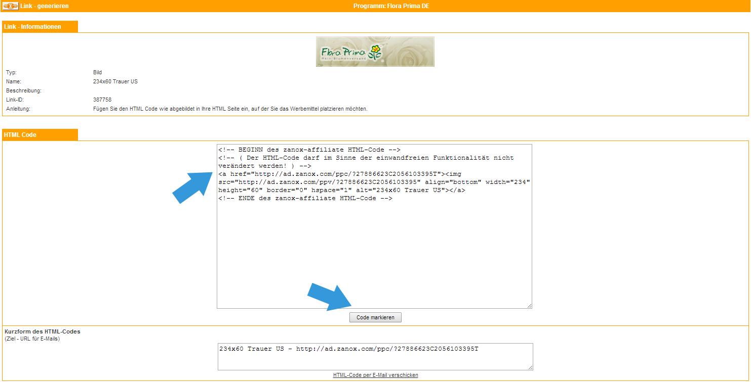 13. Wenn du ein passendes Werbemittel gefunden hast, klicke wiederum auf Code in der mittleren Spalte HTML-Code. Nun erhältst du deinen persönlichen HTML-Code, den du im Quelltext deiner Seite an der richtigen Stelle einfügen kannst.