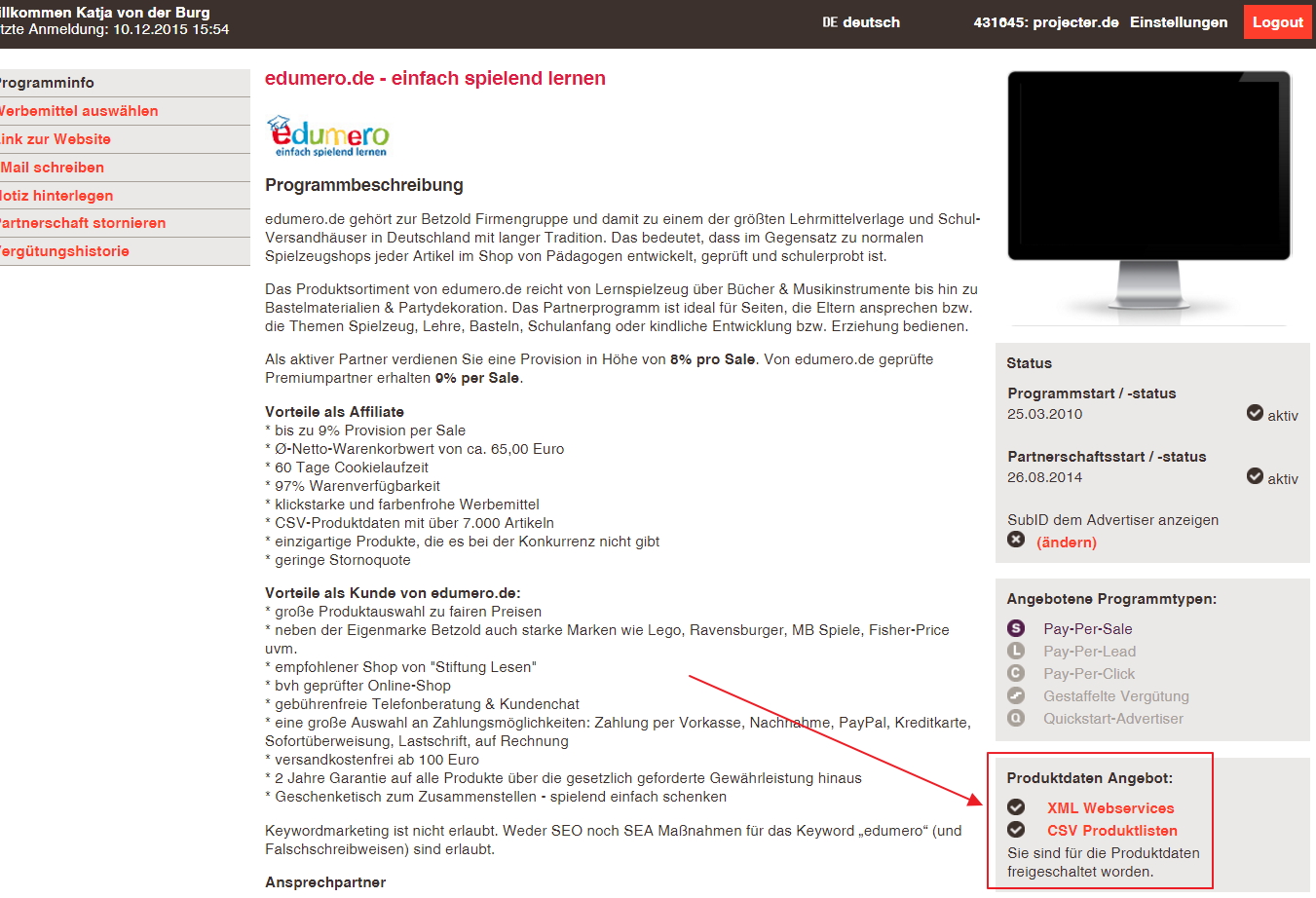 Darüber hinaus findet man die Produktdaten auf der Partnerprogrammseite, die man über die Suche erreichen kann, in der rechten Seitenspalte im unteren Drittel.