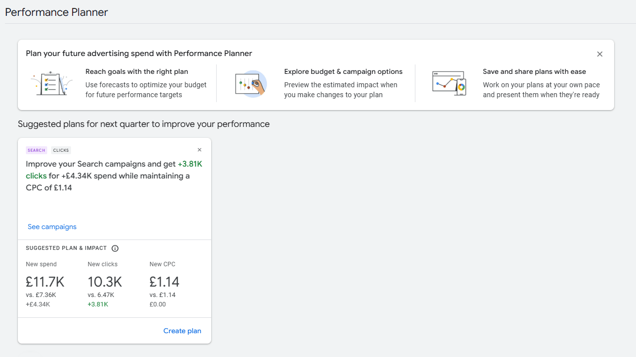 Um die Planung zu vereinfachen, hat Google Ads im Performance Planner „Suggested Plans“ eingeführt. Diese Vorschläge basieren auf den historischen Daten des Kontos und bieten Werbetreibenden eine einfache Möglichkeit, ihre Budgets und Gebotsstrategien für die Zukunft zu optimieren. Die neuen Funktionen helfen dabei, schnellere und fundiertere Entscheidungen zu treffen.