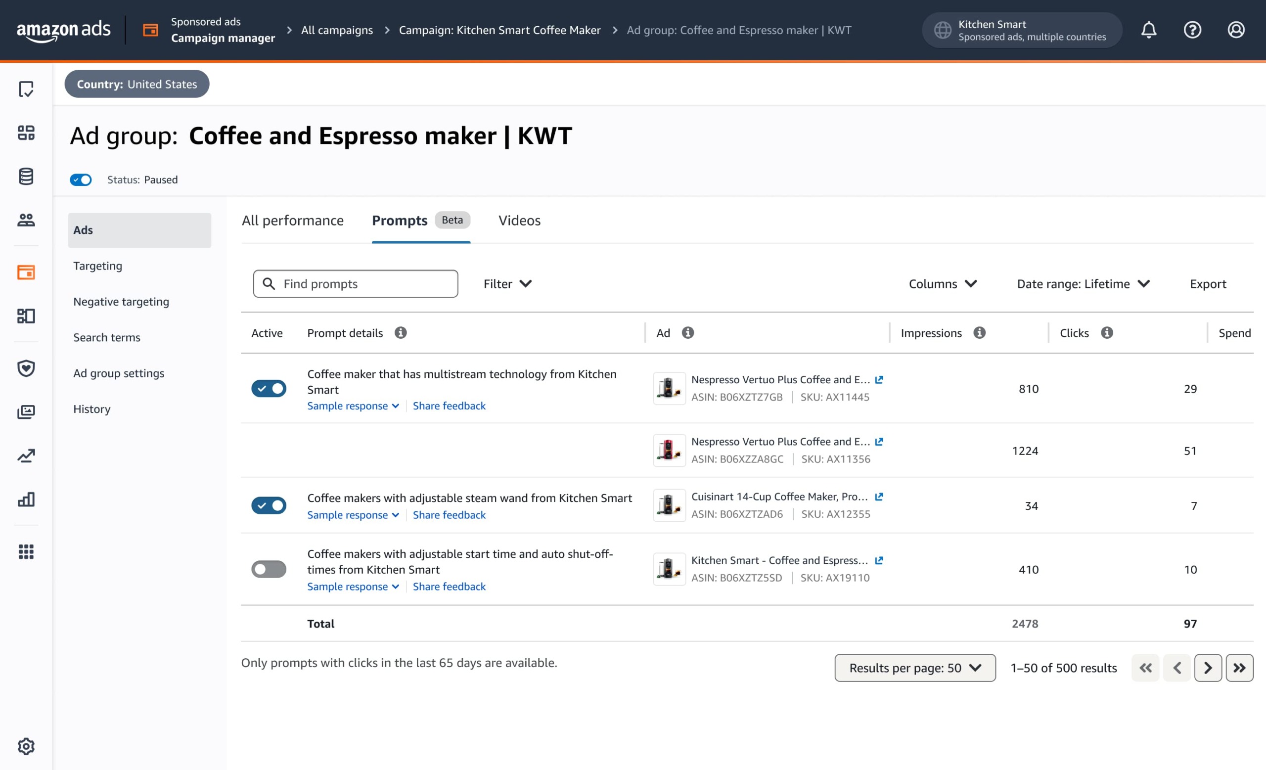 Amazon testet aktuell in den USA das Schalten von Anzeigen bei Rufus, Amazons KI-Kaufberatung, mit den Kampagnentypen „Sponsored Products“ und „Sponsored Brands“. Selbst einbuchen kann man die Prompt-Anzeigenplatzierungen nicht. Sobald Sponsored Products und Sponsored Brands in Prompts Anzeigen schalten, kann man dies über einen Bericht einsehen und die Performance überprüfen.