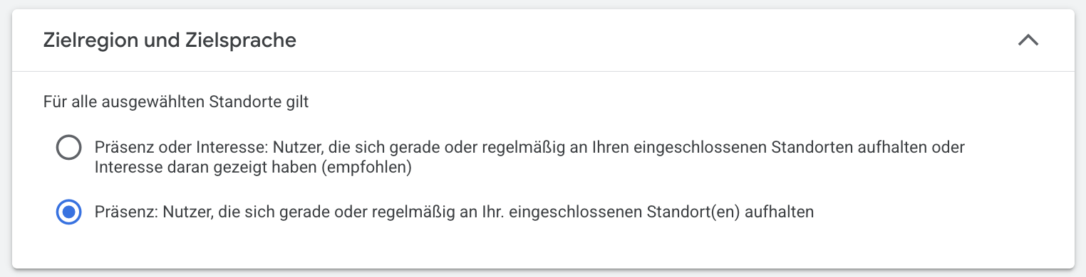 Für den Kampagnentyp Demand Gen haben wir (noch im Dezember) endlich die Möglichkeit erhalten, auf Kampagnenebene eine Ausrichtungsmethode festzulegen. Wie bei allen anderen Kampagnentypen können wir zwischen den Optionen „Interesse für oder Präsenz in meinem Zielgebiet“ oder “Präsenz in meinem Zielgebiet” wählen. Durch die Kontrolle über die Ausrichtungsmethode können Streuverluste reduziert werden.