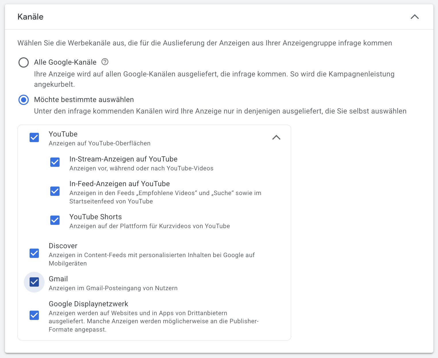 Außerdem erlaubt es Google Ads nun auch, Google Maps als Werbekanal explizit auszuwählen oder auszuschließen. Auch durch diese Funktion können Streuverluste minimiert werden. Zusätzlich kann die Performance von Demand-Gen-Kampagnen verbessert werden, falls der Kanal Google Maps nicht gut performt und deswegen von der Bewerbung ausgeschlossen werden sollte.