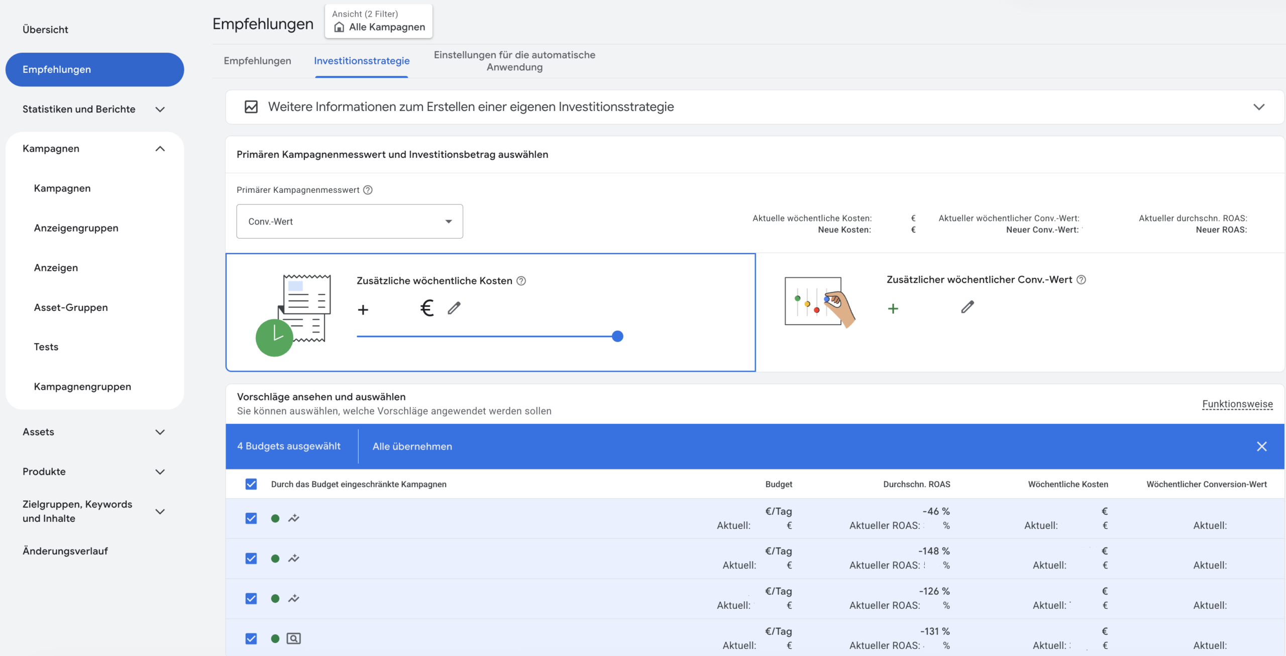 Google hat den Empfehlungstab erweitert. Im Reiter „Investitionsstrategie“ gibt Google Ads Empfehlungen, in welchen Kampagnen zusätzliches Budget eingesetzt werden kann, um die Leistung des Kontos zu steigern. Über ein Dropdown-Menü können Klicks, Conversions oder Conversion-Wert als primäre Kennzahl gewählt werden.