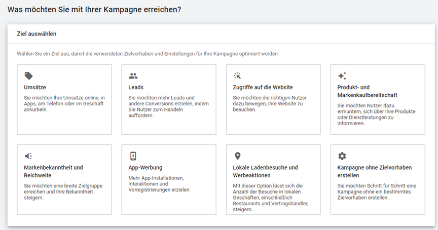 Der Anfang aller weiterführenden Google-Ads-Aktivitäten liegt genau hier: bei der Kampagnenerstellung. Dass die Wahl des Kampagnentyps womöglich etwas mit den individuellen Marketing-Zielvorhaben zusammenhängt, lässt sich schon vermuten. Denn bevor es zur Auswahl von einem der derzeit neun verschiedenen Kampagnentypen kommt, fragt sogar Google nach den eigenen Zielen.