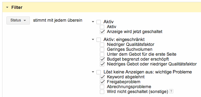 So lässt sich schnell herausfinden, welche Keywords aufgrund wichtiger Probleme keine Anzeigen auslösen.