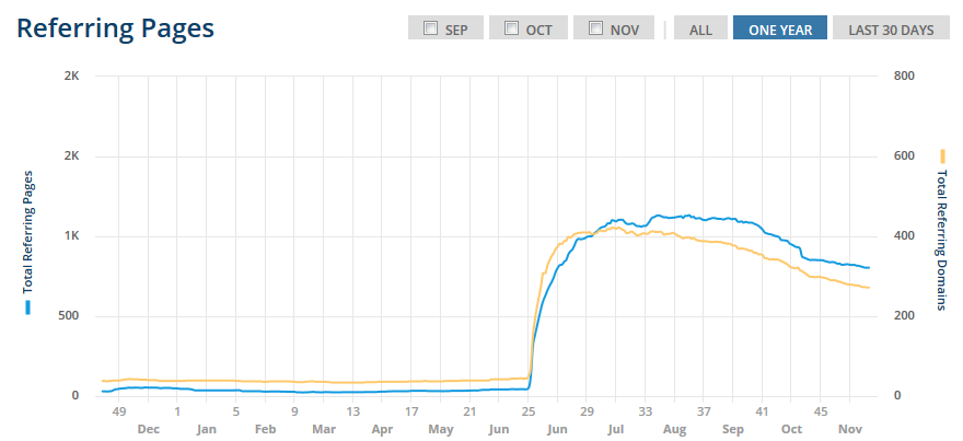 Ein erstes Indiz für einen negativen SEO Angriff, ist ein rasanter Anstieg an Backlinks. Wie im Falle unseres Kunden anhand der Explosion an neuen verweisenden Domains und Einzelseiten ab 25. Juni zu sehen ist. Bei den Domains waren es vor der Attacke 40, dann plötzlich 400.