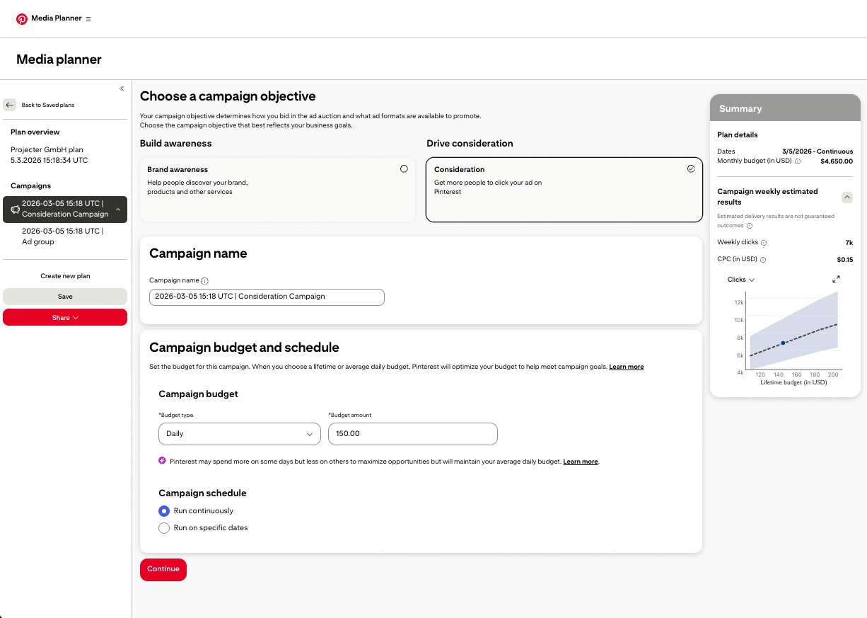 Letzten Monat hat Pinterest mit dem globalen Rollout des Media Planners ein zentrales Tool für die strategische Vorplanung direkt in den Ads Manager integriert. Das neue Feature ermöglicht es euch, die geschätzte Reichweite und Frequenz eurer Kampagnen vorab auf Basis historischer Plattformdaten zu simulieren.