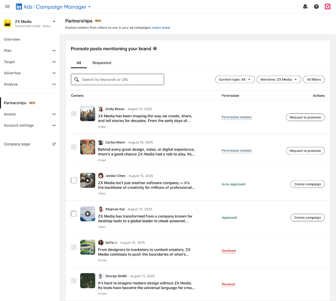 Auf LinkedIn war das Highlight des letzten Monats der neue „Partnerships“-Tab im Campaign Manager. Dieser vereinfacht das Finden von bewerbungswürdigen Inhalten massiv. Ihr könnt nun gezielt nach Posts suchen, die eure Brand erwähnen und zwar nicht nur von Mitarbeitenden, sondern von Kontakten 1., 2. und sogar 3. Grades.