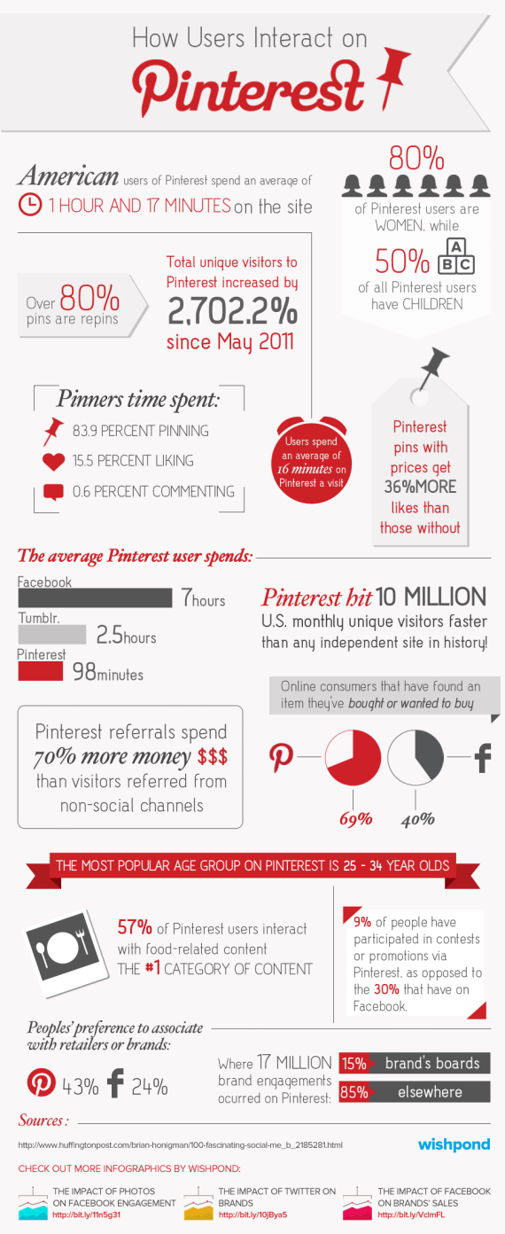 Pinterest funktioniert ganz einfach: Man erstellt eine virtuelle Pinnwand, pinnt dort Bilder und veröffentlicht dadurch diese Pins. Durch das Re-Pinnen verbreiten sich die Bilder unter den Nutzern. Außerdem können die Bilder geliked und kommentiert werden, Viralität entsteht. Hier die Zahlen: