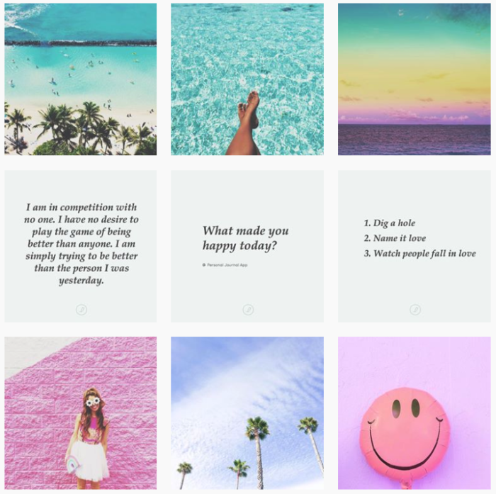 - Farbgestaltung: Wer keine Lust auf starre Kategorien für seinem Instagram-Account hat und dennoch ein ansprechendes Grid vorzeigen möchte, kann auf ein einfaches Mittel zurückgreifen. Durch die Verwendung ausgewählter Farben (z.B. im Hintergrund oder durch ein Filter) kann ohne feste inhaltliche Strukturen ein ansehnliches Muster kreiert werden. Ein Beispiel dafür ist der „Regenbogen Grid“ von @sarah_peretz.
