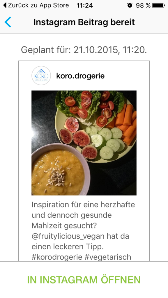 Die bei Hootsuite eingetragene Bildunterschrift wurde automatisch gespeichert und kann in der Instagram App einfach eingefügt werden. Schließlich nur noch den Urheber auf dem Bild markieren und fertig.