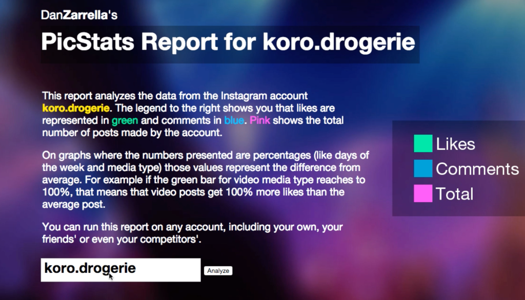 Dan Zarrella ist bekannt dafür, komplexe Daten auszuwerten. Mit PicStats erschuf er ein Analysetool, das sehr detaillierte Statistiken aus jedem Instagram Account ziehen kann. Einfach den Nutzernamen auf PicStats.com eingeben.