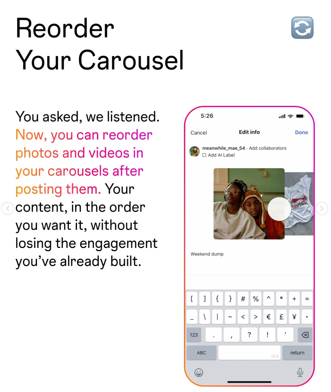 Ein Feature, auf das Instagram-Nutzer*innen und Social-Media-Manager*innen lange gewartet haben: Endlich lassen sich Carousel-Beiträge nachträglich neu ordnen. Außerdem lassen sich bereits einzelne Elemente aus einem Carousel-Beitrag löschen, jedoch keine neuen hinzufügen.