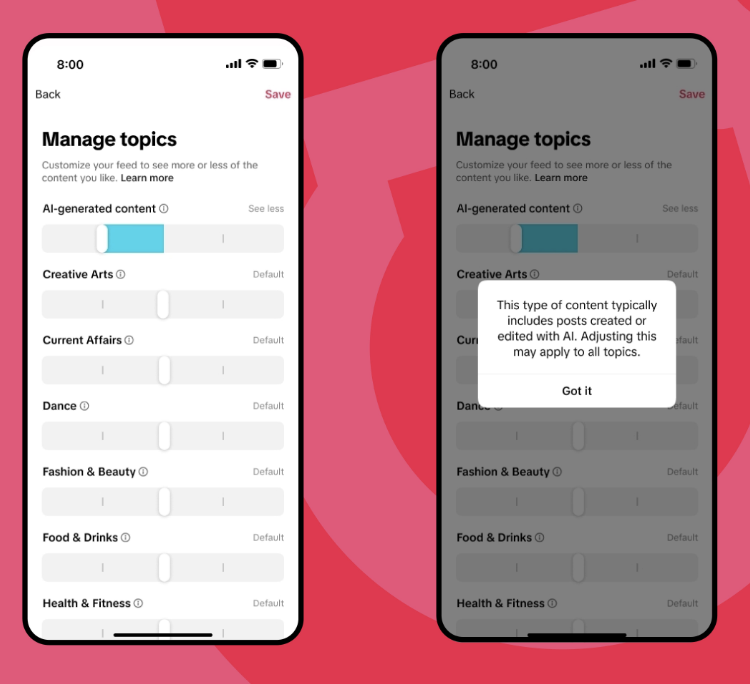 Ja, neue KI-Funktionen und AI-Apps können spannend sein. Aber wenn der eigene Feed voll mit KI-Kreationen ist, fehlen die echten Menschen. TikTok testet nun ein neues Tool, mit dem ihr selbst bestimmen könnt, wie viel KI-Content euch angezeigt wird. Über „Manage Topics“ könnt ihr dann nicht nur bestimmen, welche Themenvielfalt euch auf eurer Startseite angezeigt werden soll, sondern auch die Häufigkeit von KI-generiertem Content. Wir sind gespannt, wann das Tool ausgerollt wird.