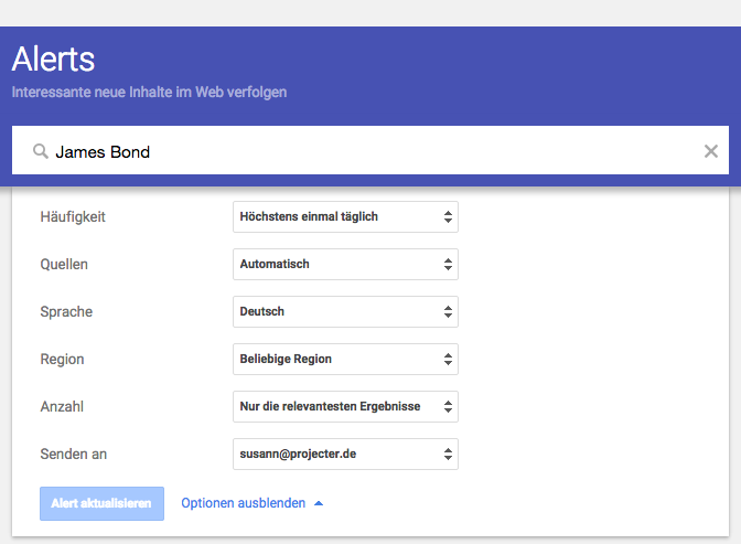 Mit der Einrichtung von Google Alerts zu relevanten Inhalten können in festgelegten Abständen Informationen über neueste Google-Ergebnisse zu einem bestimmten Thema eingeholt werden. Google Alerts eignen sich daher besonders, um zu sehen, auf welche Art und Weise das eigene Unternehmen bei Google vertreten ist. Bei Google Alerts wird selbst bestimmt, wie oft ein Alert versendet wird und auf welche Quellen sich Google bezieht.