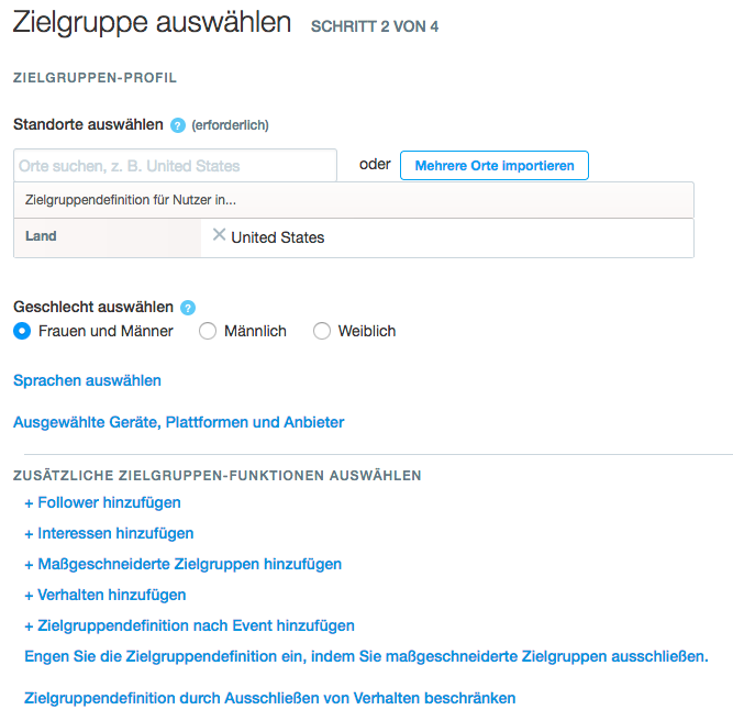Die Erstellung und Optimierung der Kampagnen ist noch nicht so ausgereift wie beispielsweise auf Facebook. Kampagnen können nicht kopiert oder dupliziert werden. Auch die Targeting-Einstellungen können nach Aktivierung der Kampagne nicht mehr geändert werden.