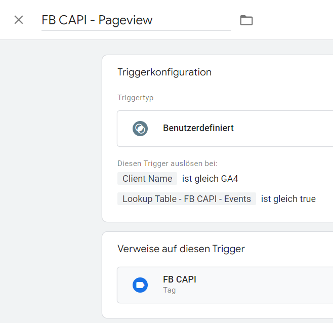 - Trigger erstellen: Der Facebook-Tag kann für alle Events genutzt werden. Hier braucht es nur einen Trigger, der alle Events, die getrackt werden sollen, abdeckt. Wir empfehlen, mit einer Suchtabellen-Variable zu arbeiten. Hier seht ihr die Facebook-CAPI-Trigger und die genutzte Suchtabelle: