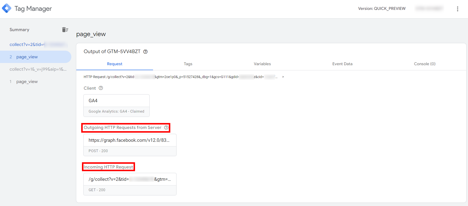 Der Server-GTM öffnet in der Vorschau nur den Tab zum Debugging. Ausschließlich der Web-Container öffnet neben dem Tab zum Debugging auch einen Tab mit der Webseite. Hier könnt ihr genau die Aktionen durchführen, die ihr testen wollt und anschließend im Debugging-Tab des Web-Containers prüfen, ob der GA4-Tag entsprechend gefeuert wird. Im Debugging-Tag des Server-GTM könnt ihr dann überprüfen, ob die gewünschten Tags ausgelöst und die Informationen korrekt übermittelt werden.