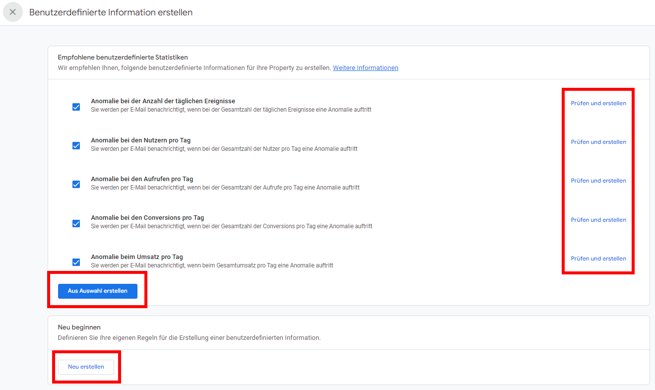 - Man übernimmt die Auswahl und klickt direkt auf „Aus Auswahl erstellen“. Damit übernimmt man die fünf vorgefertigten Alerts und bekommt entsprechend der Definitionen Informationen zu Anomalien, wenn diese auftreten. Anomalie als Bedingung bedeutet hier, dass Google auf Basis seiner AI entscheidet, ob eine Benachrichtigung versendet wird oder nicht.