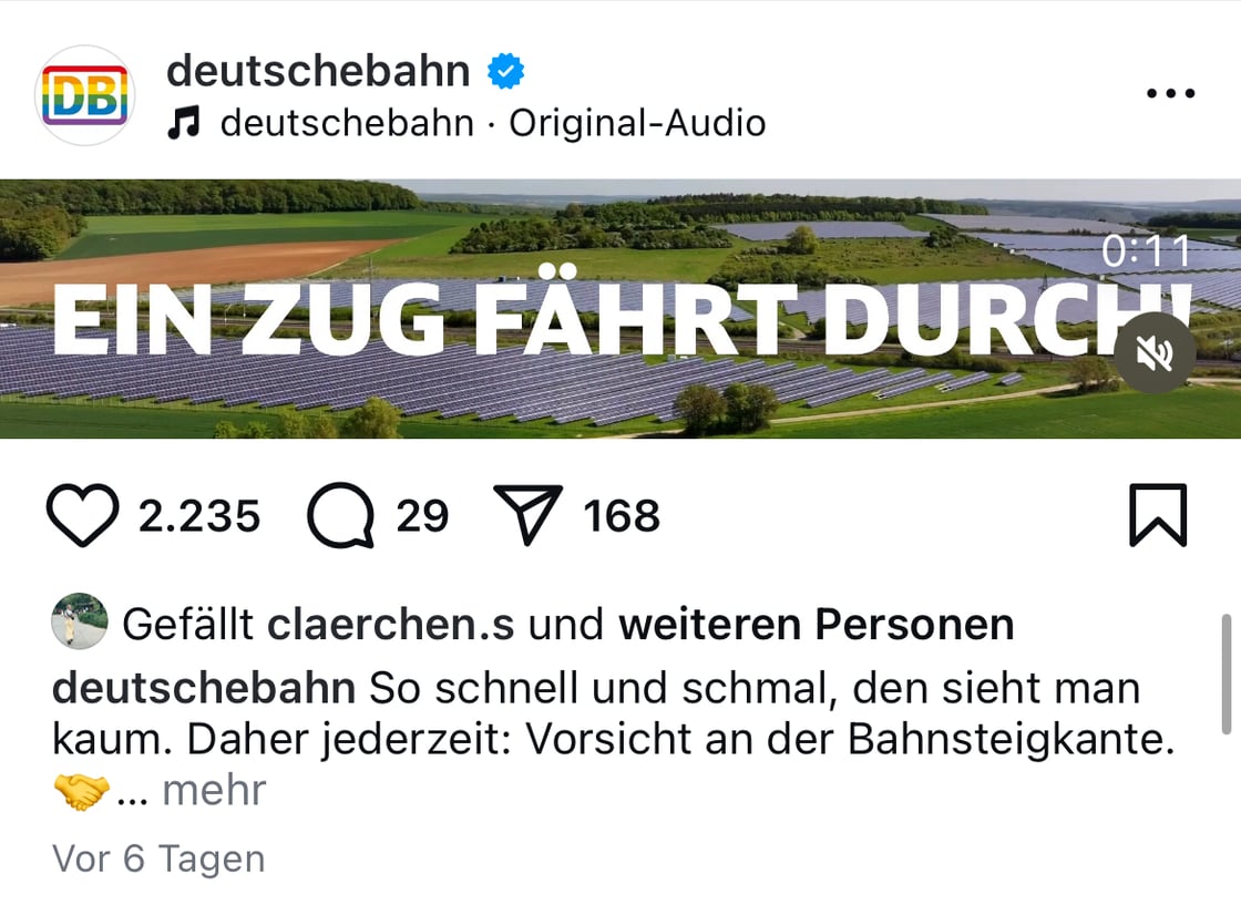 Ein Grund für die angestiegene Nutzung von Instagram könnten die vielen neuen Funktionen sein, die in den letzten Monaten dazugekommen sind und die App für Marken und Creator besonders spannend macht. Aktuell taucht beispielsweise ein ganz neues “skinny Video” Format auf, was auch von vielen Unternehmen, wie der Deutschen Bahn, bereits genutzt wird: