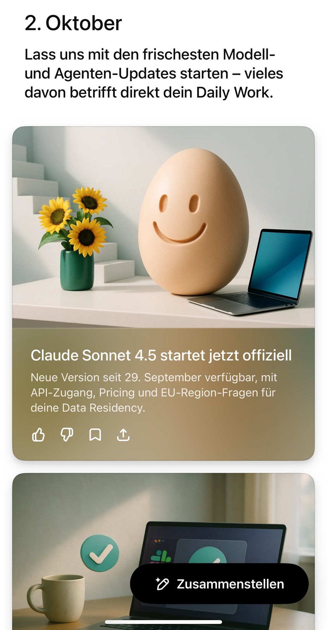 Sorry für das billige Wortspiel, aber not sorry. Mit Pulse testet das OpenAI ein proaktives Briefing-Format, das Nutzer*innen morgens mit personalisierten Infos, Erinnerungen und Empfehlungen versorgt – „Google Now zehn Jahre später“, wie Analyst Benedict Evans kommentiert. Die Idee dahinter dürfte sein, dass viele Nutzer*innen immer noch herausgefordert sind, was sie mit der KI produktiv tun können. Statt einem leeren LLM-Eingabefeld sollen vorkonfigurierte KI-Produkte helfen, hier Inspiration und Use Cases zu liefern. Pulse steht im moment nur im Pro-Abo zur Verfügung und nur in der Mobil-App. Wir konnten es schonmal testen und sind bislang eher ein bisschen underwhelmed. Die „News“ sind häufig schon ein paar Wochen alt und nicht sonderlich originell. Die grundlegende Idee könnte sich allerdings schon als ziemlich nützlich erweisen.