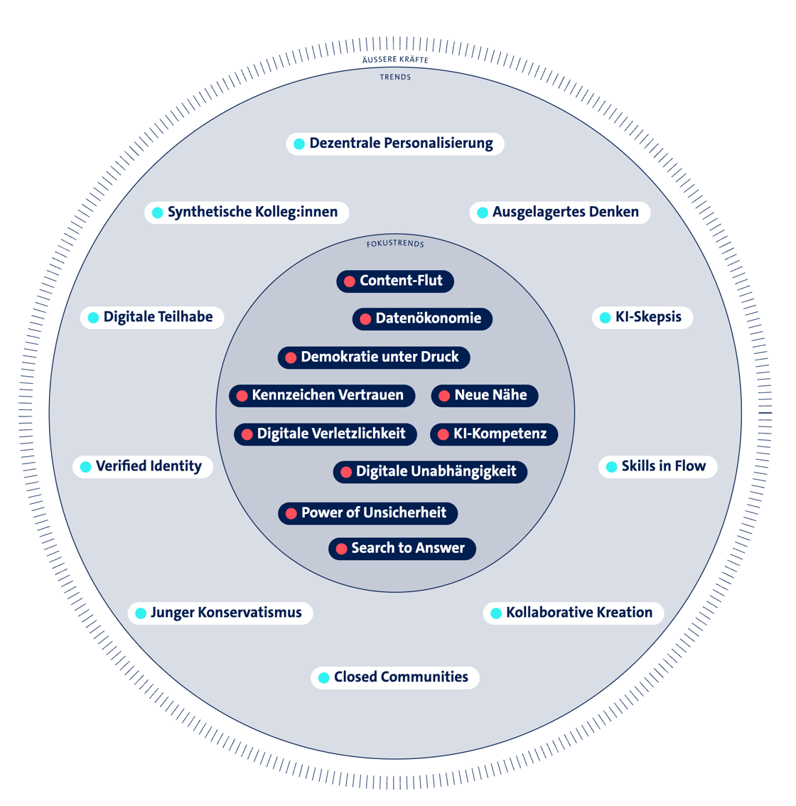 Der jährlich erscheinende ARD Trendradar soll Entwicklungen aufzeigen, die besonders relevant für die Zukunft des öffentlich-rechtlichen Rundfunks sind. Da das recht nah an unserer Lebenswirklichkeit als Medien-Konsument*innen ist, haben wir uns das mal näher angeschaut. Alle 20 Trends sind in der Grafik dargestellt. Bei den Fokustrends fällt auf, dass sich die meisten um Vertrauen, Daten und zuverlässige Quellen drehen.