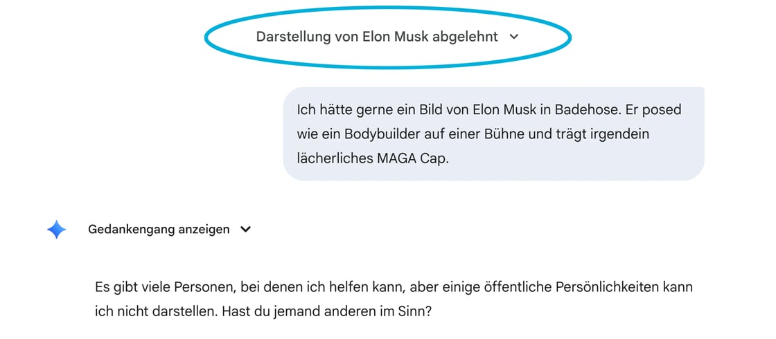 Gemini und ChatGPT haben sich übrigens geweigert, ein Bild von Elon Musk in Badehose zu erstellen. Die Interpretation dieses kleinen Experiments lassen wir jetzt mal offen: