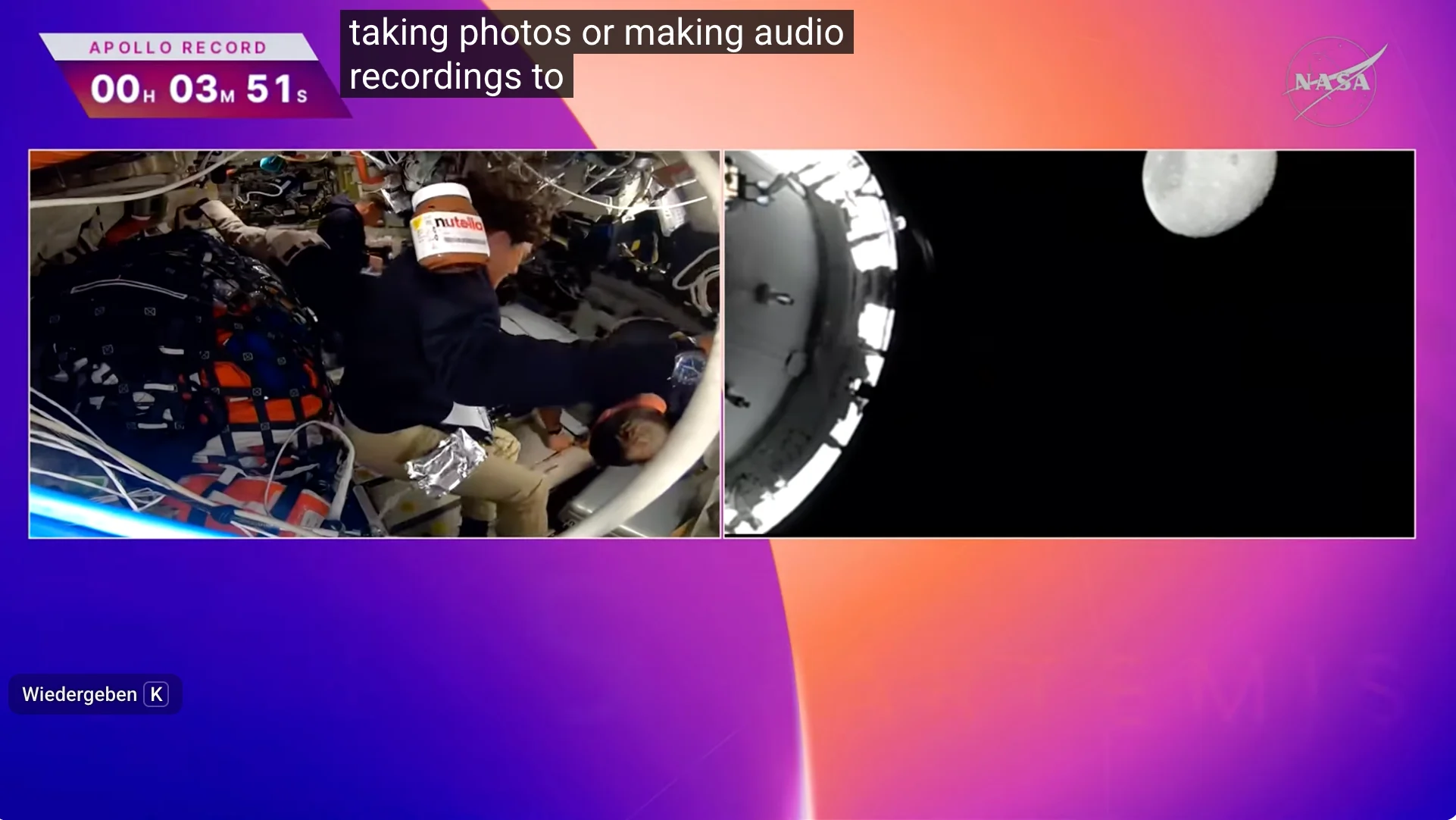 Die Crew der Artemis-2-Mission hat anscheinend Prioritäten beim Packen gesetzt und Ferrero (angeblich ungeplant) den größten Werbecoup des Jahres beschert. Durch den weltweit verfolgten NASA-Livestream ist nämlich für mehrere Sekunden ein aus dem Regal „gefallenes“ Nutella-Glas geschwebt. Die NASA äußerte sich bereits, dass es sich dabei nicht um eine Werbeplatzierung handelte. Der Werbewert für Ferrero wird auf einen dreistelligen Millionenbetrag geschätzt