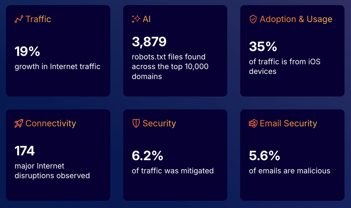 Cloudflare hat seinen „Year in Review“ Report veröffentlicht, der Trends und Muster in der Web-Nutzung des vergangenen Jahres basierend auf seinem globalen Netzwerk zeigt. Er offenbart ein Wachstum des weltweiten Internet-Traffics um 19 % – vor allem auch durch Bots. Allein der Googlebot machte 4,5 Prozent der weltweiten HTML-Zugriffe aus.