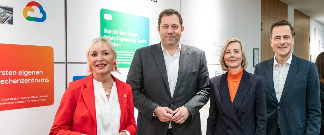 Hessens Digitalministerin Prof. Dr. Kristina Sinemus und Lars Klingbeil, Bundesminister der Finanzen, mit Google Cloud EMEA North Vice President Dr. Marianne Janik und Google Central Europe Vice President Philipp Justus bei der Pressekonferenz (Quelle: Google).