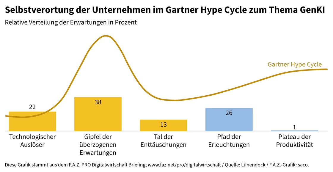 Im Digitalwirtschafts Briefing von F.A.Z. Pro haben wir eine spannende Zusammenfassung der Studie „GenAI – Die neue Realität in der IT-Organisation 2026+“ von iteratec, kobaltblau, Lünendonk & Hossenfelder und VOICE gefunden. Demnach sind 38 % der befragten IT-Verantwortlichen in (deutschen) Unternehmen gerade in ihrer KI-Nutzung auf dem Gipfel der überzogenen Erwartungen, von dem es leider für 13 % schon bergab ins Tal der Enttäuschungen ging.