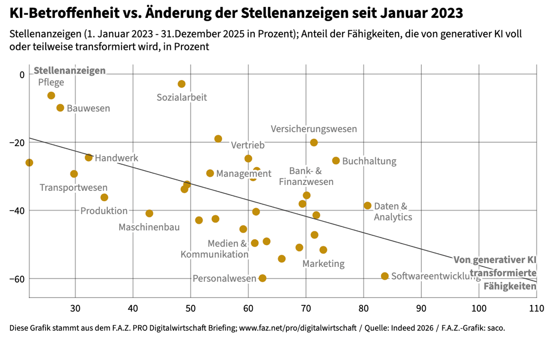 Künstliche Intelligenz scheint für einen deutlichen Rückgang der Stellenausschreibungen in einigen Branchen in Deutschland verantwortlich zu sein. Eine Analyse der Stellenbörse Indeed für F.A.Z. Digitalwirtschaft ergab, dass vor allem Einsteigerjobs und juniorige Stellen betroffen sind. Am deutlichsten ist der Rückgang in der Software-Entwicklung sichtbar (-59 % in den letzten 3 Jahren), aber auch Marketing, Personalwesen, Kundenservice und IT-Support sind stark betroffen.