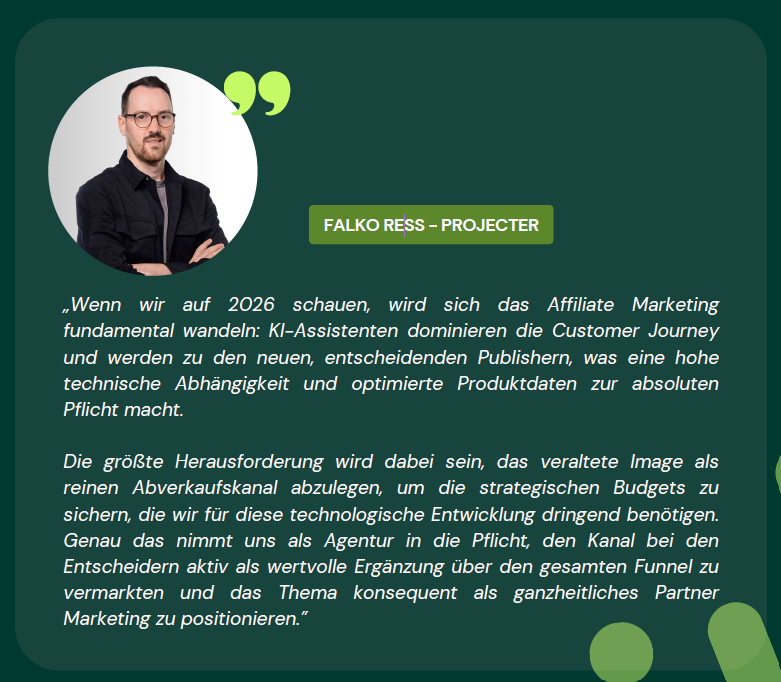 Doch wer glaubt, es ginge einfach „weiter so“, der irrt. KI ist für 88 Prozent der Advertiser das dominierende Thema und verändert die gesamte Customer Journey. Die Wirkung von Empfehlungen verlagert sich zunehmend in kontextuelle KI-Umgebungen, was uns vor die Aufgabe stellt, Beiträge dort messbar zu machen, wo klassische Klick-Logiken künftig vielleicht nicht mehr greifen. Parallel dazu rollen Social und Creator Commerce das Feld neu auf: Influencer zählen für Advertiser zu den Top-Wachstumstreibern. Für uns heißt das: Affiliate Marketing 2026 ist weit mehr als ein Abverkaufskanal am Ende des Funnels – es ist ein strategischer Partner, der Kaufentscheidungen frühzeitig und in neuen Umgebungen prägt.
